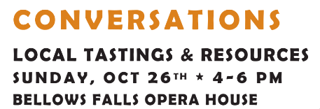 With a primary goal of learning more about the needs of farmers, homesteaders, food producers and restaurateurs, this 2-hour gathering at the Bellows Falls Opera House (Lower Theater) includes delicious, locally sourced tastings, a few inspiring short films by Graham Meriwether, and a handful of facilitated listening stations where your ideas, visions, concerns & insights as a grower, food producer/maker and community member can be shared.